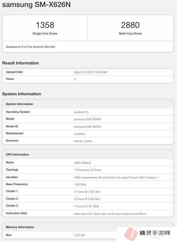 本站 3 月 26 日消息,科技媒体 xpertpick 昨日(3 月 25 日)发布博文,报道称三星 Galaxy Tab S10 FE+ 平板现身 GeekBench 跑分库,6.4.0 版本单核成绩为 1358 分,多核成绩为 2880 分。