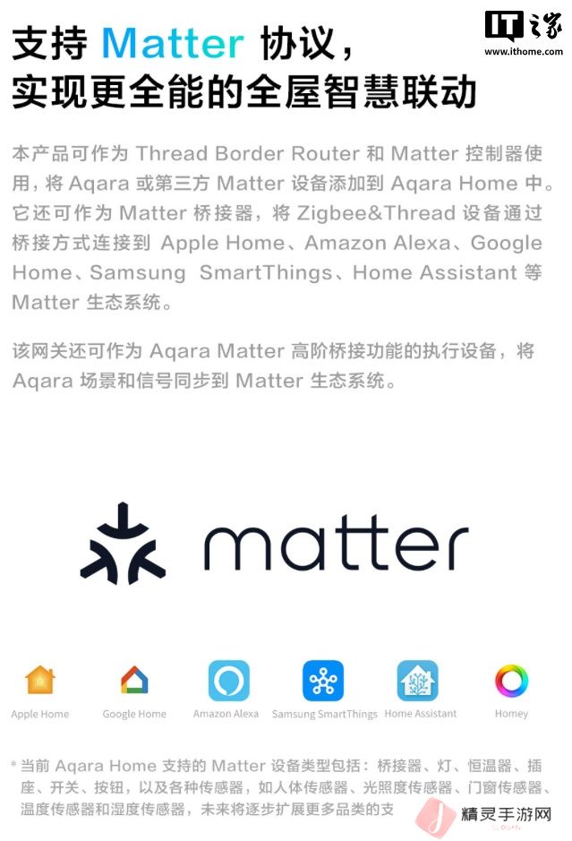 根据绿米官方介绍,该网关同时兼容 Zigbee 和 Thread 子设备,实现不同协议智能家居的互通;同时该网关可作为 Thread Border Router 和 Matter 控制器使用,将 Aqara 或第三方 Matter 设备添加到 AqaraHome 中。还可作为 Matter 桥接器,将 Zigbee 和 Thread 设备通过桥接的方式连接到苹果家庭、亚马逊 Alexa 和谷歌 Home 等生态。