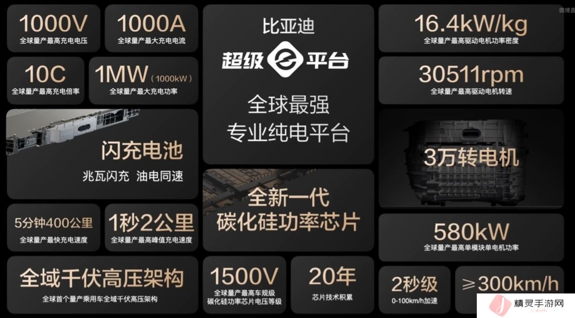 比亚迪还发布了“全球最强”专业纯电平台超级 e 平台,具备 3 万转电机、全域 1000V 高压架构、单电机功率 580kW、超过 300km/h 的最高车速。本站附该平台主要特性介绍图如下: