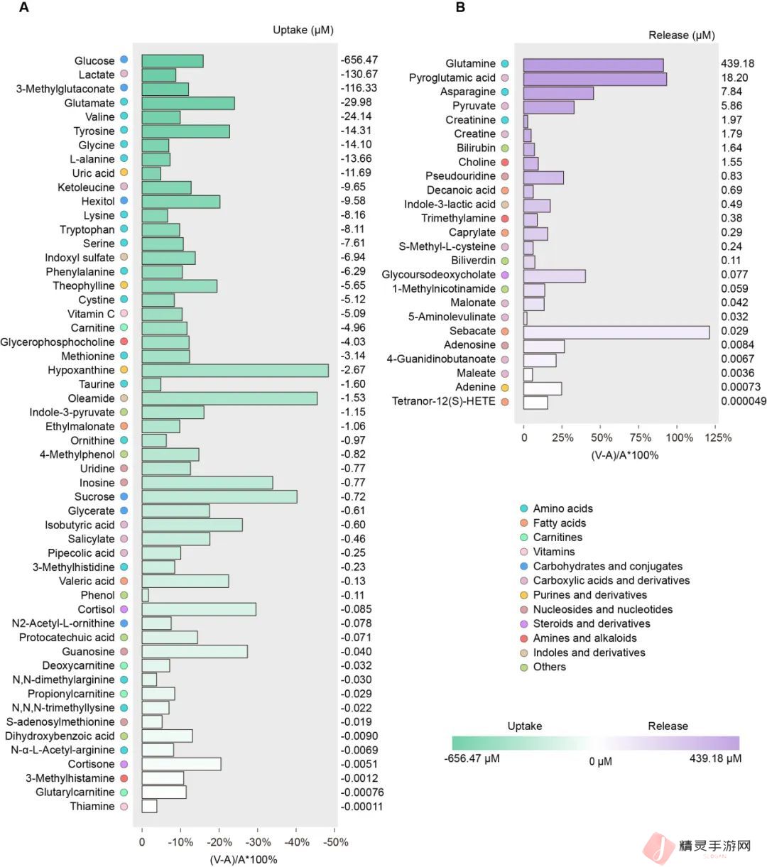 在人脑动静脉代谢组数据中,研究团队发现,大脑对葡萄糖的净摄取绝对量最高(656.47 μM),次黄嘌呤(hypoxanthine)为净吸收率最高的代谢物,动脉中 48.4% 被大脑摄取。