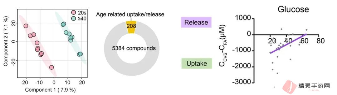 研究者进一步探讨了年龄对人脑代谢的影响,分析了年龄与脑部代谢物摄取和释放的相关性,鉴定出 8 种代谢物和 15 种脂质的血脑交换特性与年龄相关。随着年龄增长,大脑对葡萄糖的摄取减少,反映出大脑代谢活性的降低。大脑对 TAG 48:3 (18:1) 的消耗随年龄增长而增加,大脑释放的天冬酰胺(asparagine)、胆绿素(biliverdin)和溶血磷脂酰胆碱(LPC)随年龄增长而增加。
